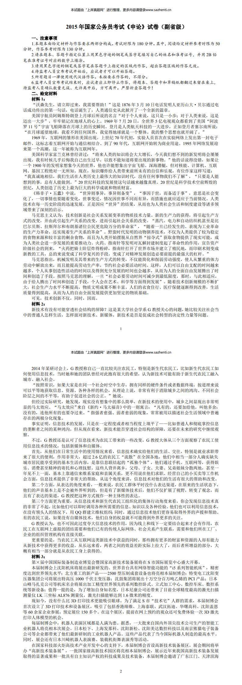 2015年国家公务员考试《申论》试卷及答案(省部级)
