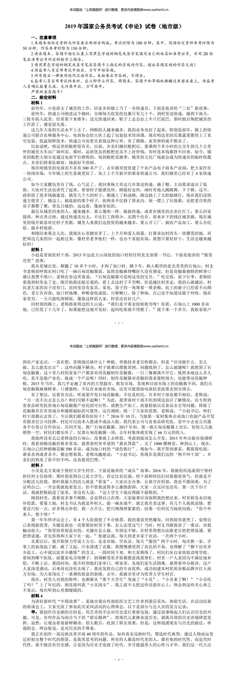 2019年国家公务员考试《申论》试卷及答案(地市级)