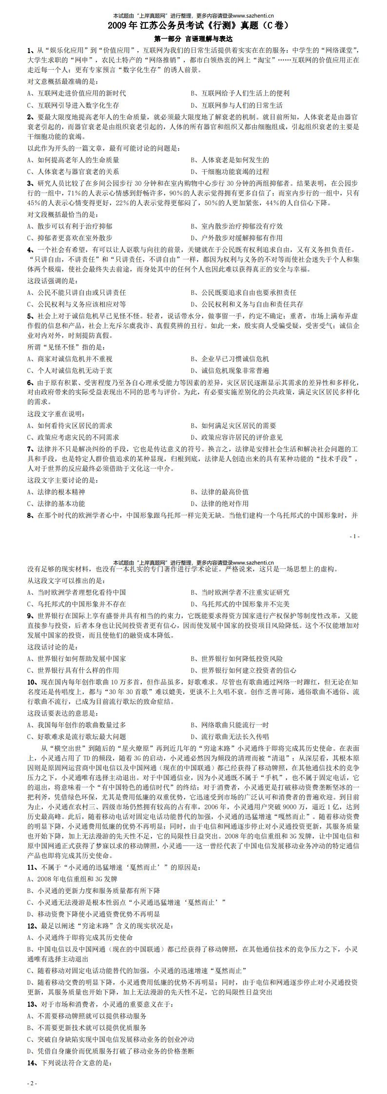 2009年江苏公务员考试《行测》真题及答案解析(C卷)