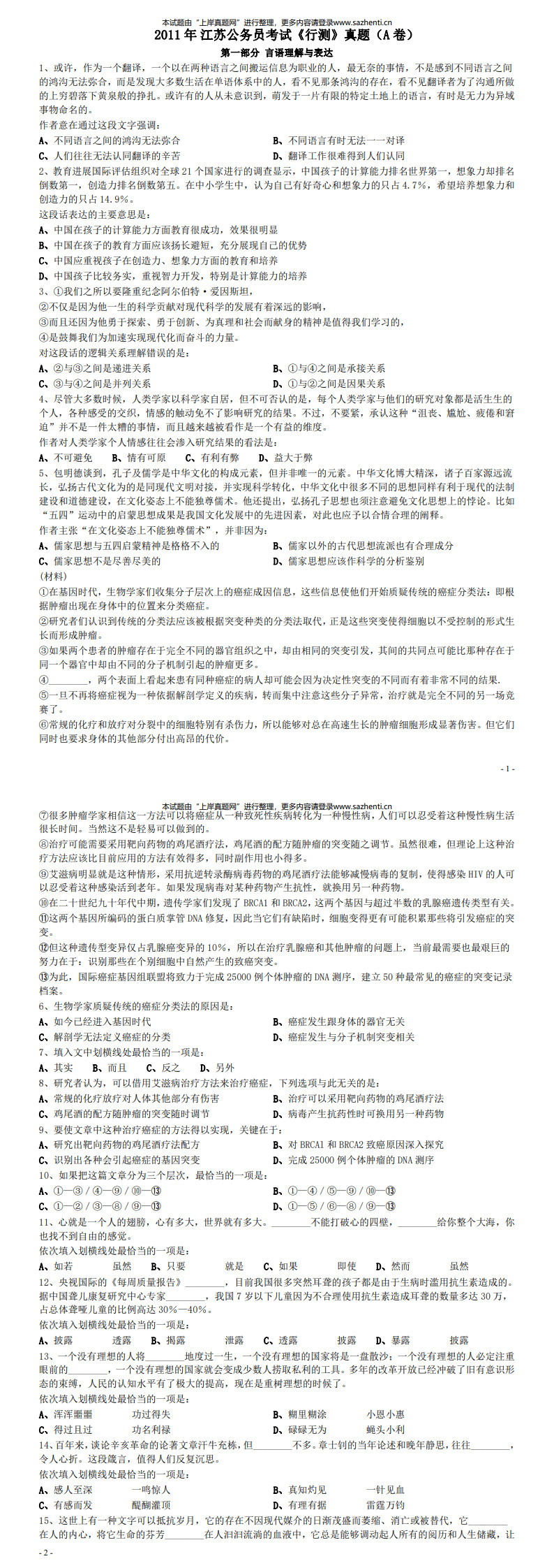 2011年江苏公务员考试《行测》真题及答案解析(A卷)