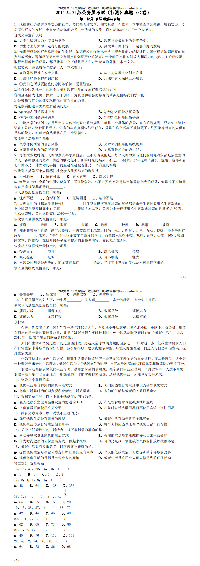 2011年江苏公务员考试《行测》真题及答案解析(C卷)