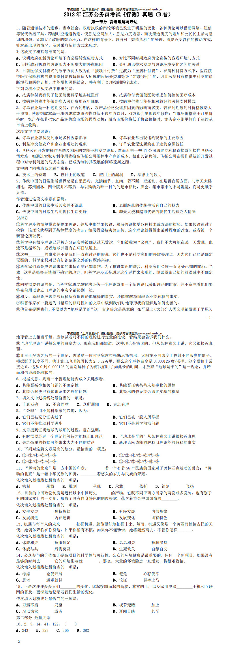 2012年江苏公务员考试《行测》真题及答案解析(B卷)