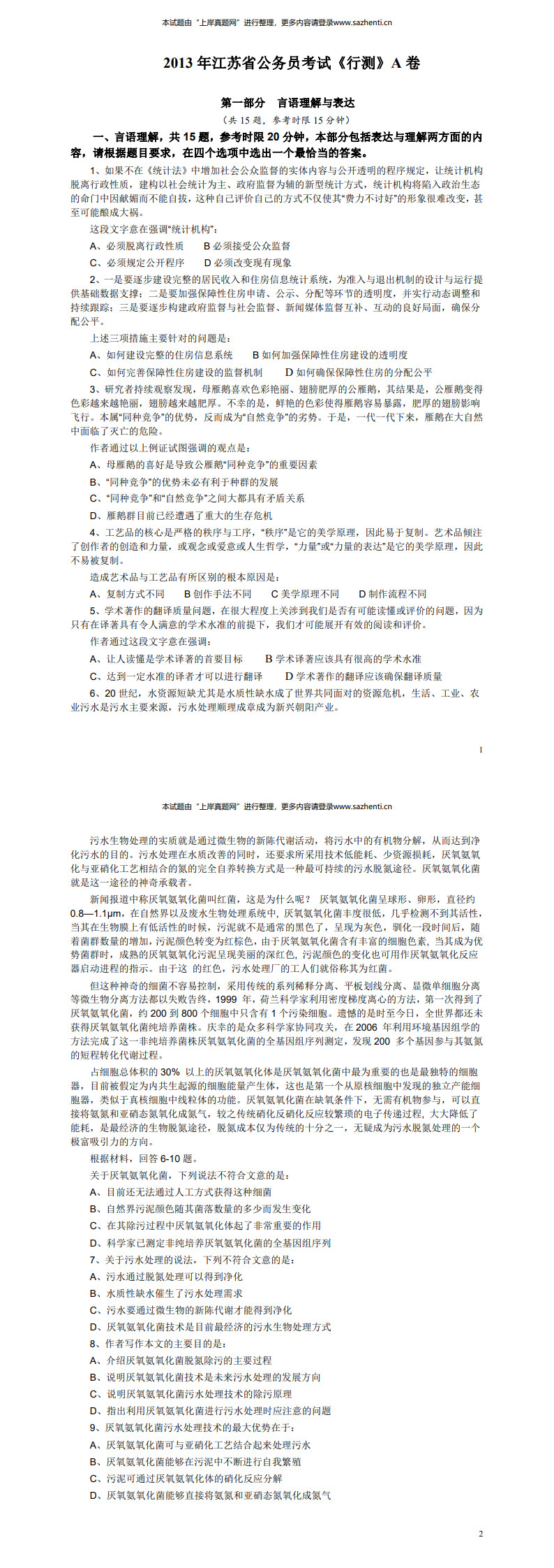 2013年江苏省公务员考试《行测》真题及答案解析(A卷)