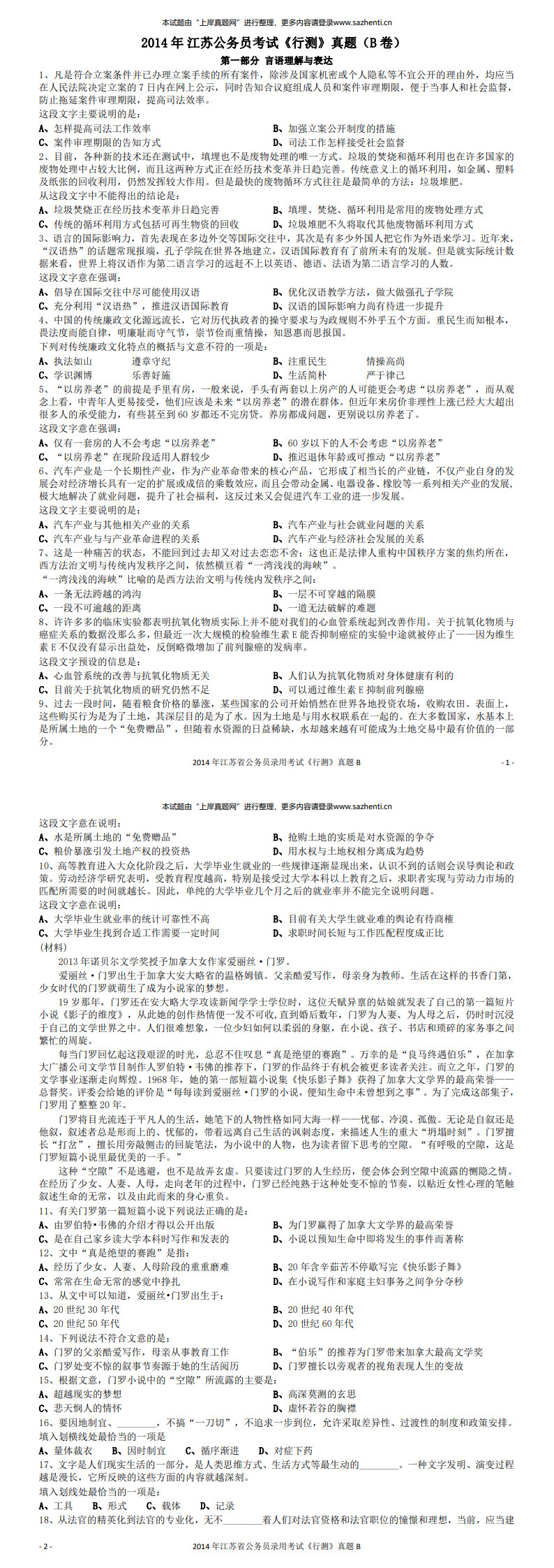2014年江苏公务员考试《行测》真题及答案解析(B卷)