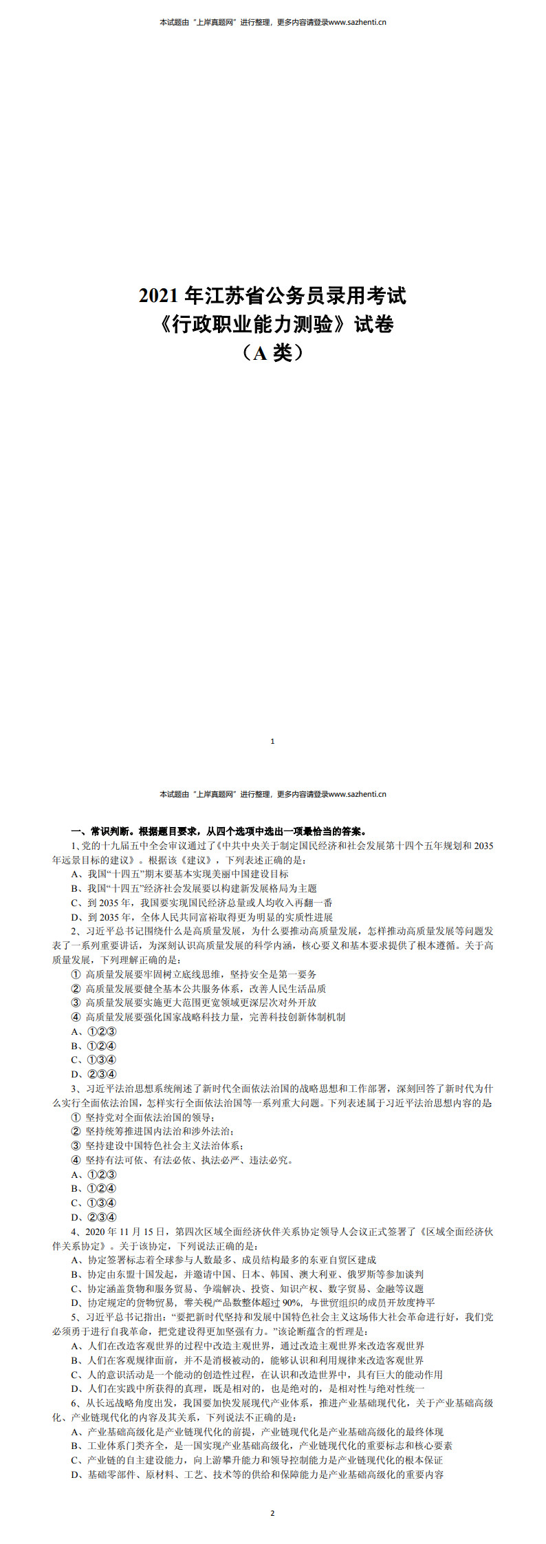 2021年江苏公务员考试《行测》真题及答案解析(A类)