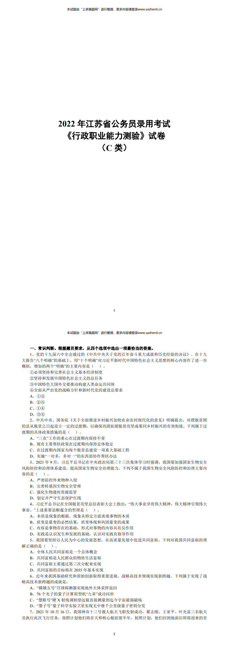 2022年江苏省公务员录用考试《行测》试卷及答案解析(C类)