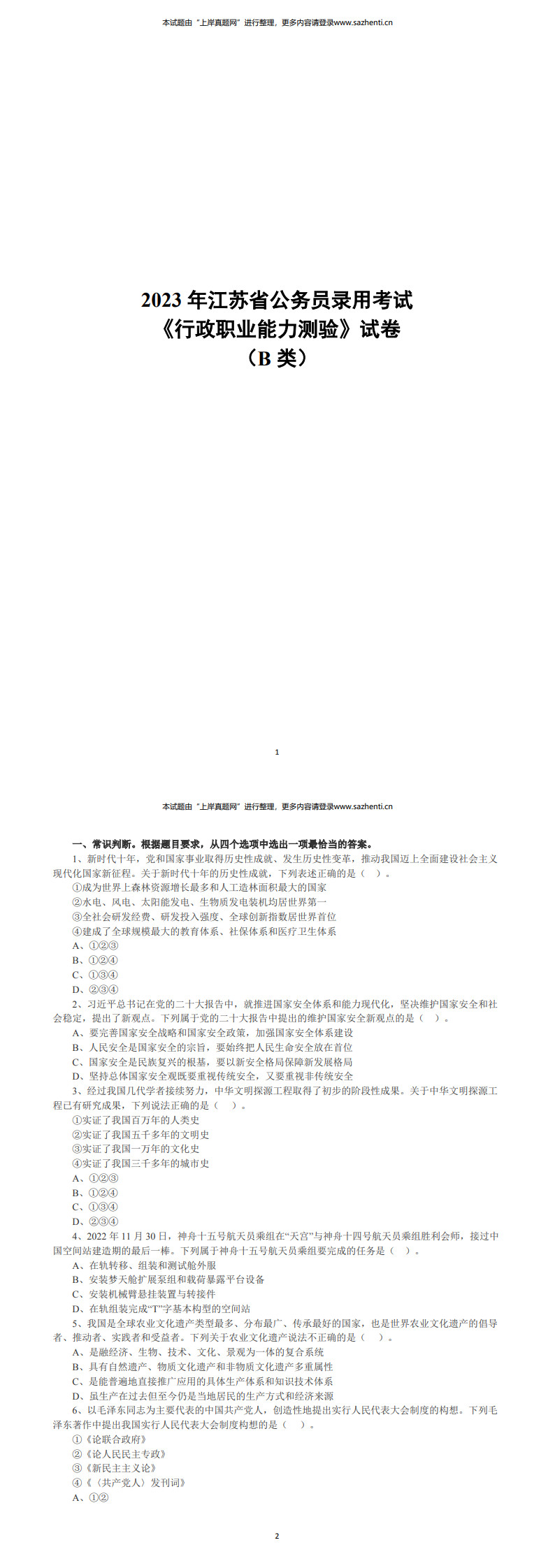 2023年江苏省公务员录用考试《行测》试卷及答案解析(B类)