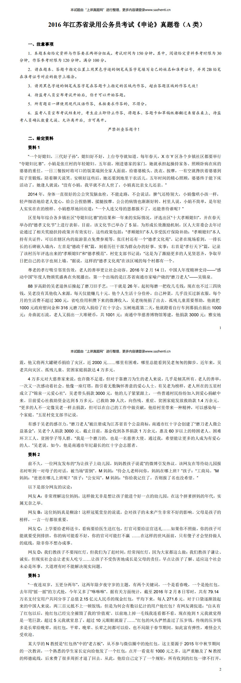2016年江苏公务员考试《申论》真题(A类卷)及解析