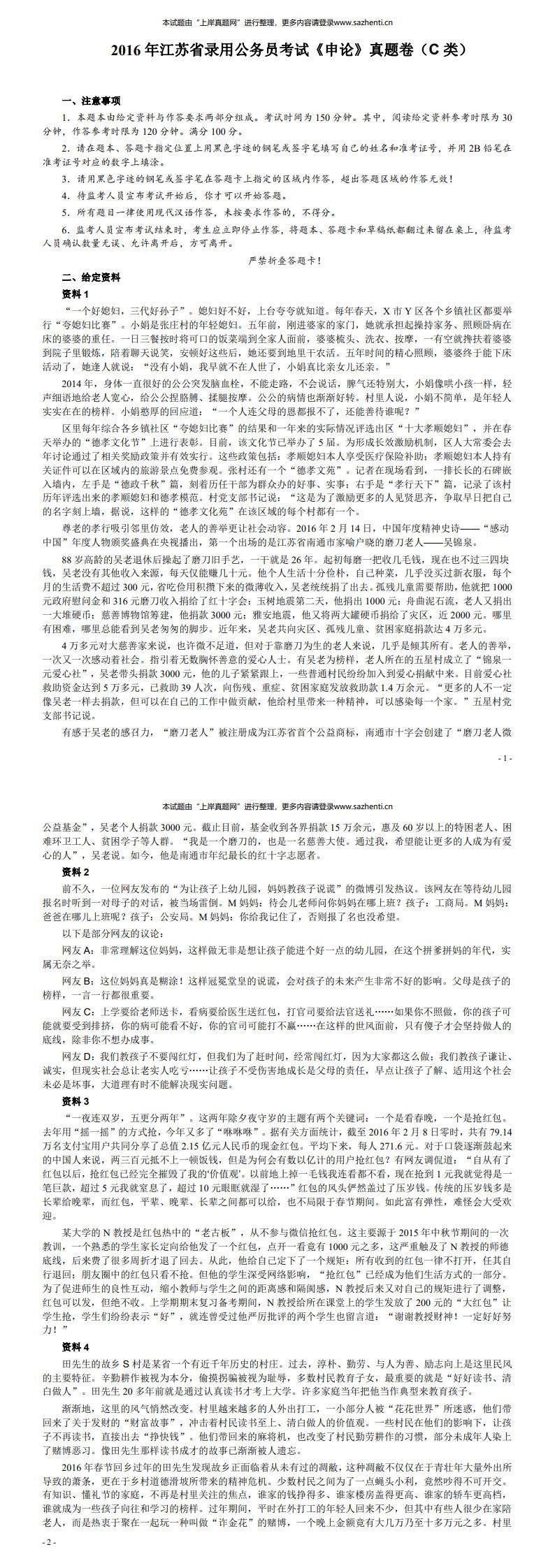 2016年江苏公务员考试《申论》真题(C类卷)及解析