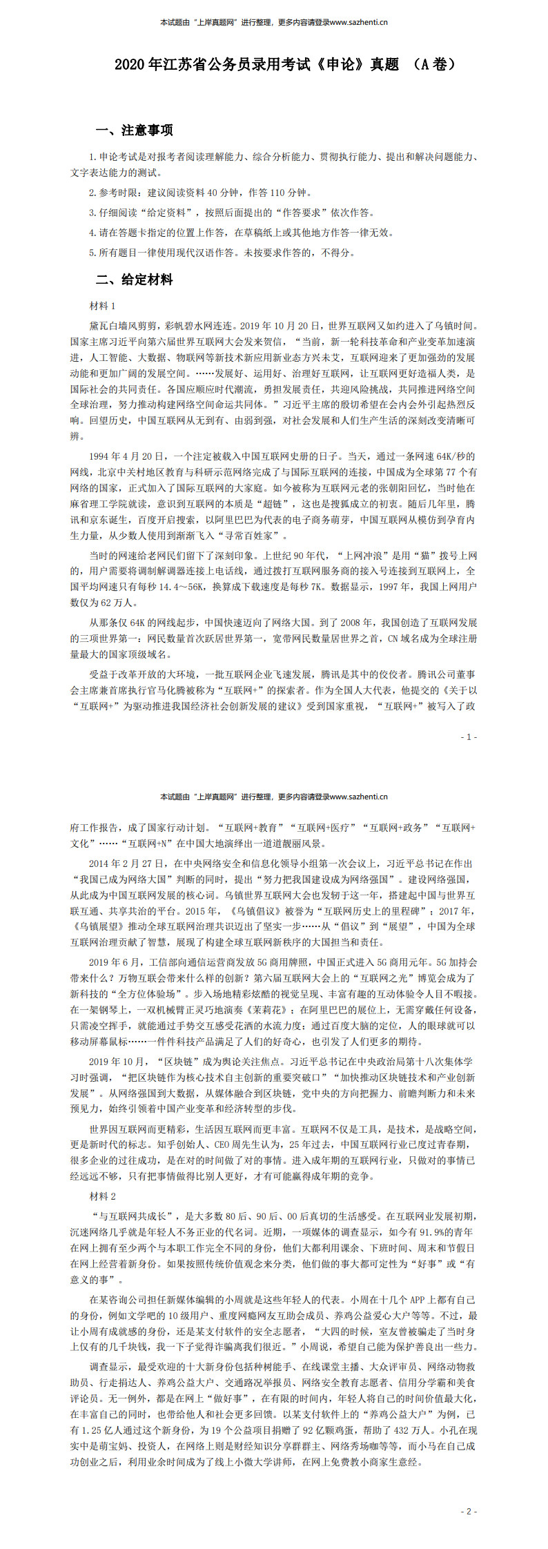 2020年江苏公务员考试《申论》真题(A类)及参考答案